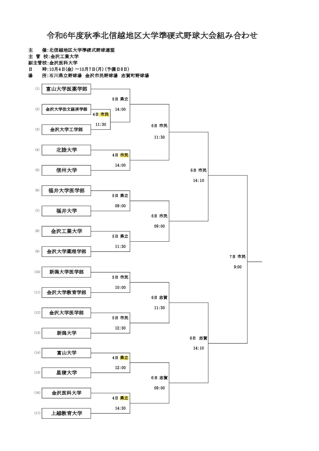 天候不良により、10/4の開会式会場(石川県立球場⇒金沢市民球場)および試合会場を変更しております。※各チーム主将に連携済 ご確認及びお間違えのないようにお願いいたします。 下記の日程及び会場で令和6年度秋 …