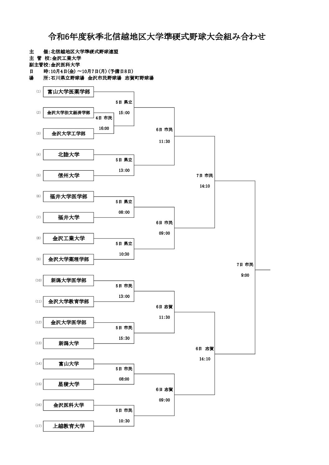 【会期】 令和6年6月1日(土)~3日(月) 予備日6月4日(火) 【会場】 福井県:福井県営球場 福井フェニックススタジアム 【主管校】 福井大学 【組合せ】 大会組み合わせ表 令和6年度北信越地区 …