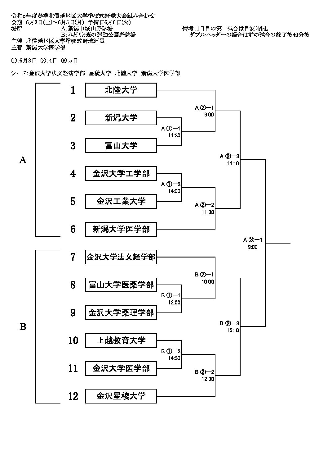 【会期】 令和5年6月3日(土)~5日(月) 予備日6月6日(火) 【会場】 新潟県:新潟市城山野球場 みどりと森の運動公園野球場 【主管校】 新潟大学医学部 【組合せ】 大会組合せ表 令和5年度北信 …