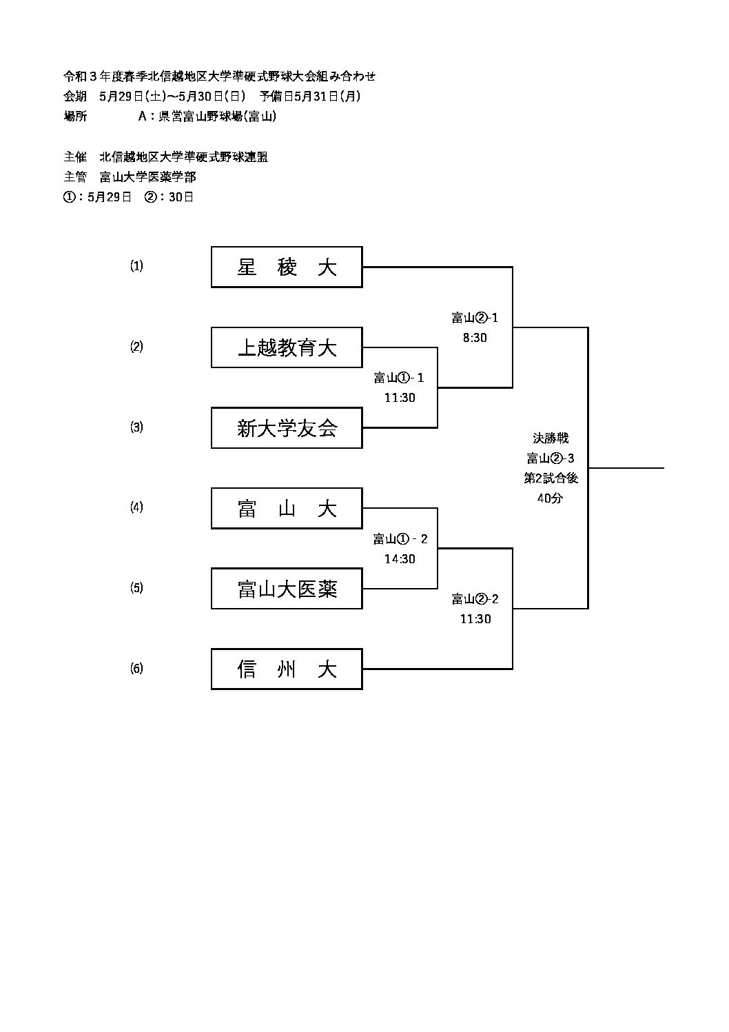 5/29㈯~5/30㈰ 県営野球場にて令和3年(2021年)度春季北信越地区大学準硬式野球大会が開催されました。 5月29日 県営富山野球場 第1試合 新潟大学学友会-上越教育大学 1 2 3 4 5 …