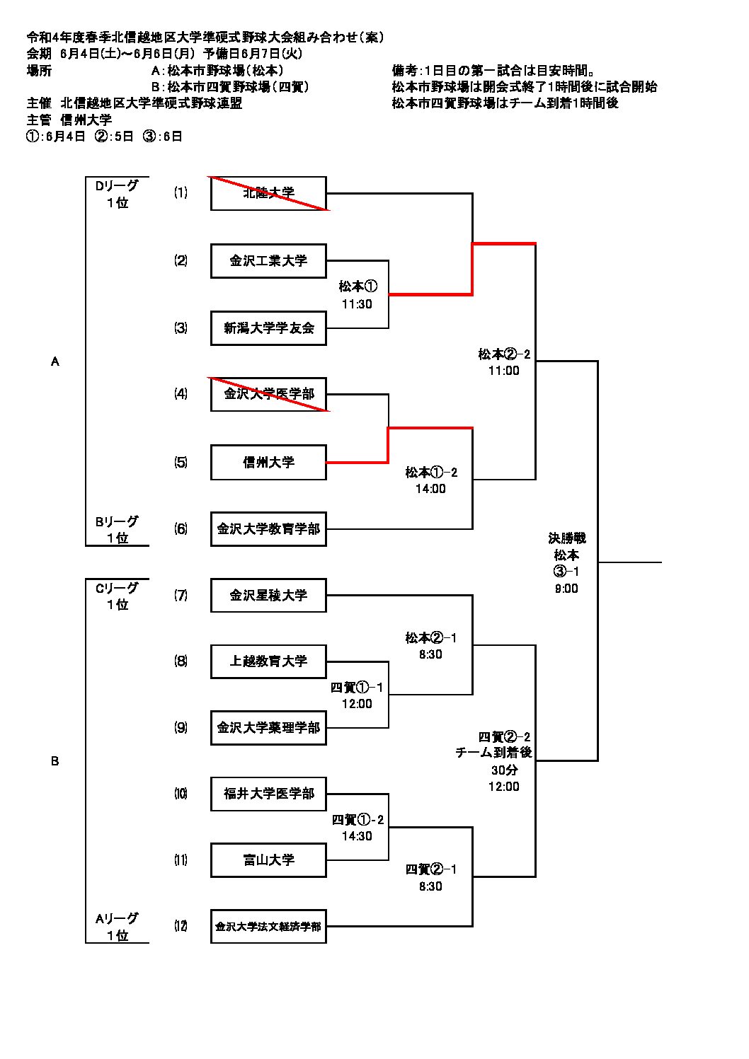 試合詳細はリンク先をご確認ください 〇松本市野球場 第1試合 金沢星稜大学0-4上越教育大学 第2試合 信州大学10-11新潟大学学友会 〇松本市四賀野球場 第1試合 富山大学0-10金沢大学法文経国際学部 …