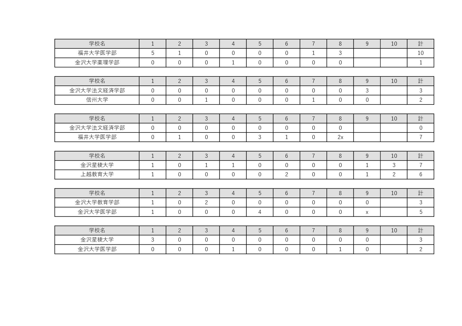 試合詳細はリンク先をご確認ください 〇金沢市民球場 第1試合(準々決勝) 福井大学医学部 10-1(8回コールド) 金沢大学薬理学部 第2試合(準々決勝) 金沢大学法文経国際学部 3-2 信州大学 第3試合(準決勝) 金 …